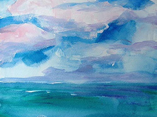 After a certain point rainbows might not make the most satisfying subject matter, so a simple suggestion to help get you take advantage of this amazing weight loss discovery is to make a horizontal line across your paper and paint sky above and water below. The color of the light or clouds can reflect in the water. The first month I was in Hawaii I did almost nothing but paint the water and sky. Granted, I was in a very inspiring location, but it also helped ease my homesick heart. You can look out your window, use a vacation photo or images from magazines. Blur the paint: feel the atmosphere, the vaporous quality of the clouds, the changing light. Just be careful not to judge your efforts or your will cancel out the weight loss benefits.
